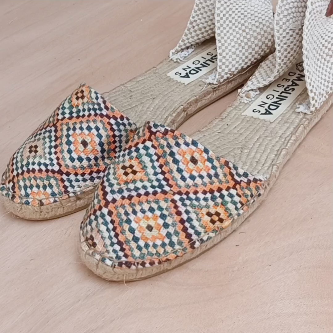 Work the perfect boho outfit from the ground up with these beautiful espadrilles in a bohemian orange print. 100% vegan featuring classic fabric "taloneras" from Spain instead of leather heels.
